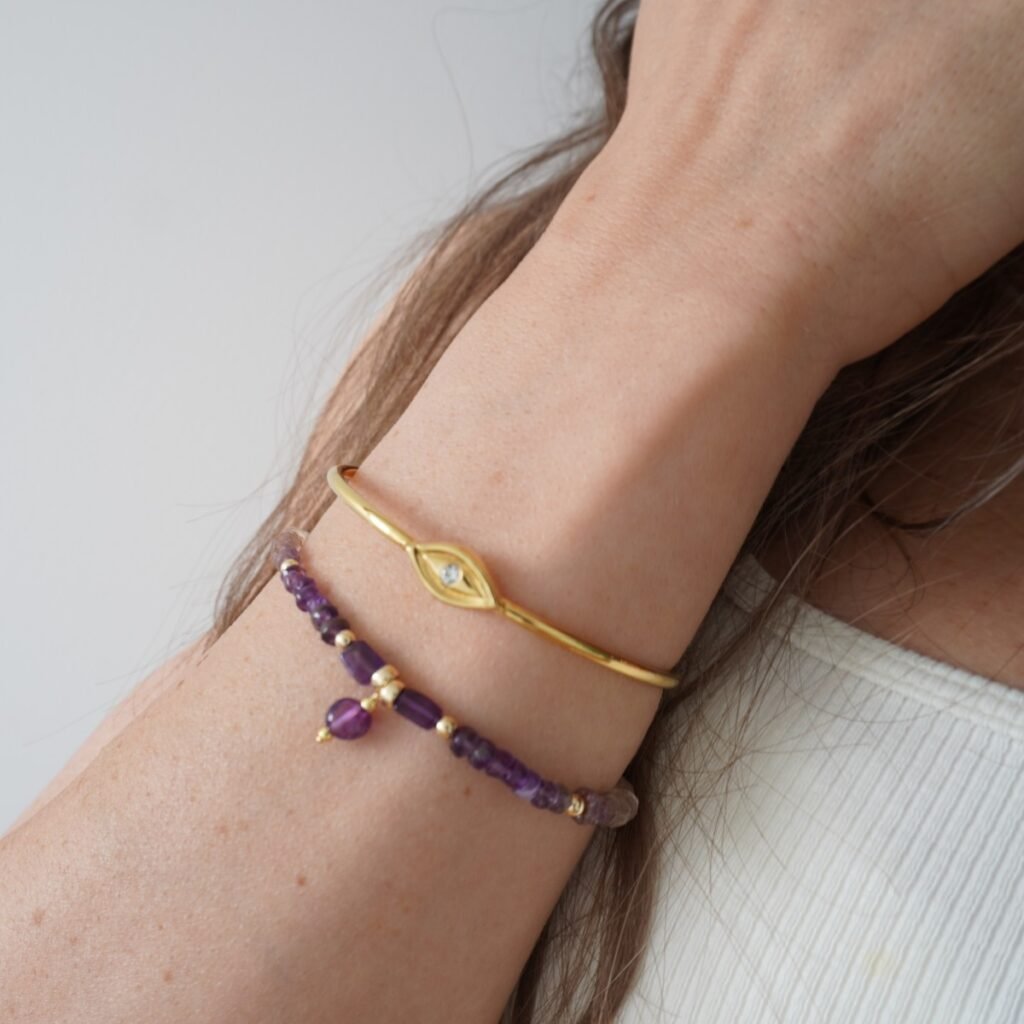 Handcrafted in Sterling Silver and 20k Gold Vermeil, The Guardian Bracelet is designed as a subtle statement. This is a piece you reach for in moments that matter, rather than something worn without thought. A timeless symbol for those who move through the world with sensitivity, intention, and awareness. At its centre sits the protective eye, long believed to shield the wearer from unwanted energies and ill intentions. A quiet symbol of watchfulness and safety, created to move with you as you protect your peace, honour your boundaries, and continue becoming.